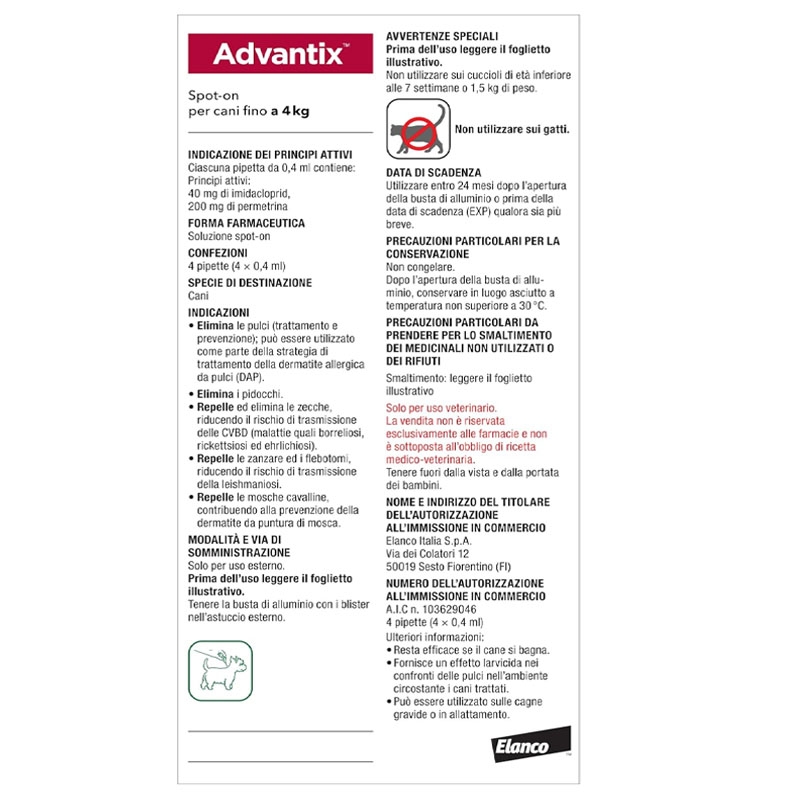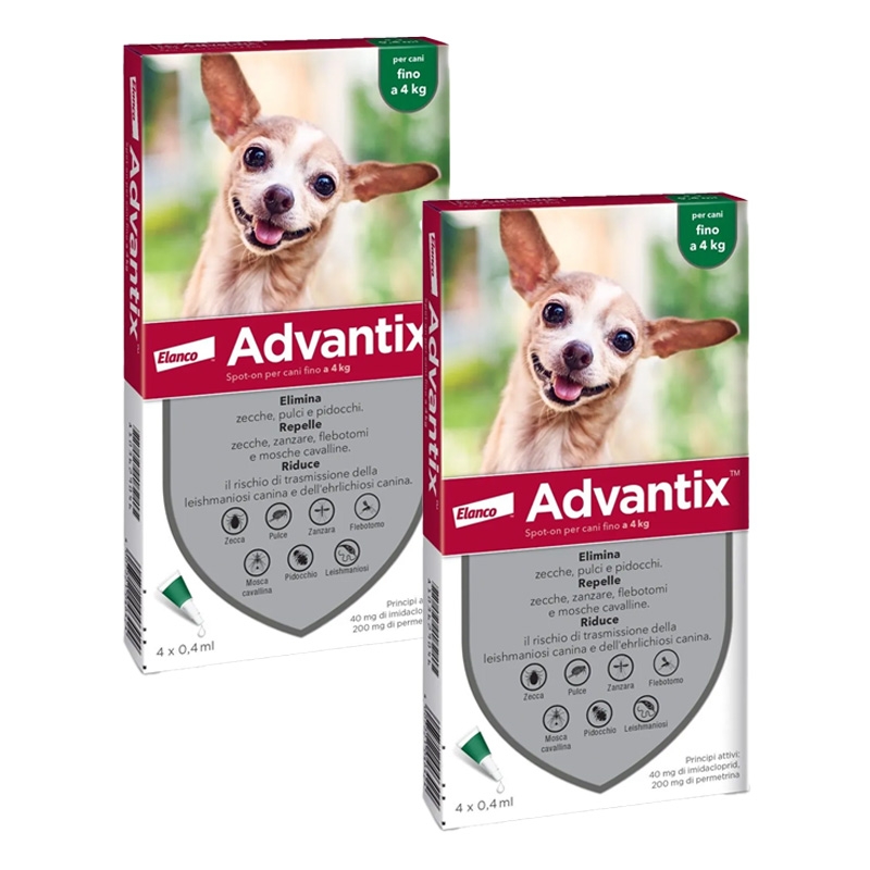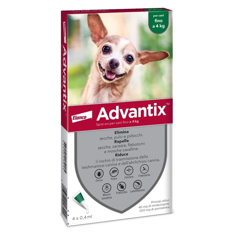 Advantix 0-4 kg è una pipetta antiparassitaria appositamente formulata per i cani mini con un peso compreso tra 0 e 4 kg. Questa pipetta, sviluppata dai Laboratori Bayer, è stata progettata per prevenire e ridurre l'insorgenza di zecche, pulci, zanzare e altri insetti per 4 settimane. Si consiglia di consultare il vostro veterinario per confermare che questo trattamento sia adatto al vostro cane.