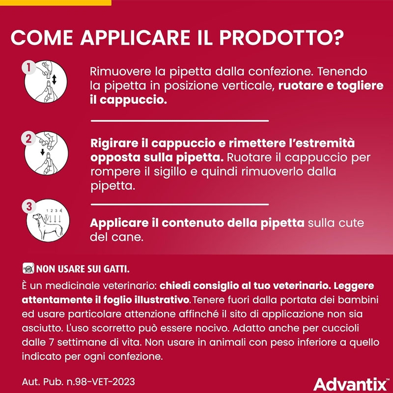 Disponibile anche per altre taglie: Advantix 4-10 kg per cani piccoli e Advantix 10-25 kg per cani di taglia media.