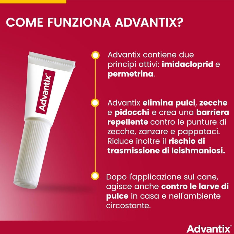 Dopo l'applicazione della pipetta, le pulci (Ctenocephalides canis) vengono eliminate in 24 ore e le zecche (Rhipicephalus sanguineus) in 48 ore. Il trattamento agisce anche come repellente contro le zanzare flebotome (Phlebotomus papatasi). Gli ingredienti attivi di Advantix (imidacloprid e permetrina) disattivano il sistema nervoso degli insetti.