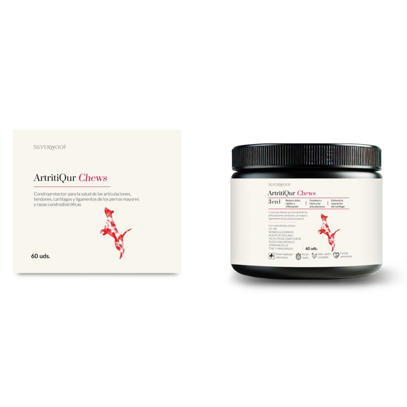 ArtritiQur Chews condroprotettore per cani è un innovativo integratore per le articolazioni in formato di snack articolari per cani, studiato per migliorare la mobilità, ridurre l’infiammazione e favorire il benessere quotidiano del tuo cane. Disponibile nei formati da 30 e 90 chews, combina ingredienti avanzati come UC-II® (collagene di tipo II non denaturato), Boswellia Serrata e Micro-PEA, offrendo un’alternativa superiore alla glucosamina tradizionale.