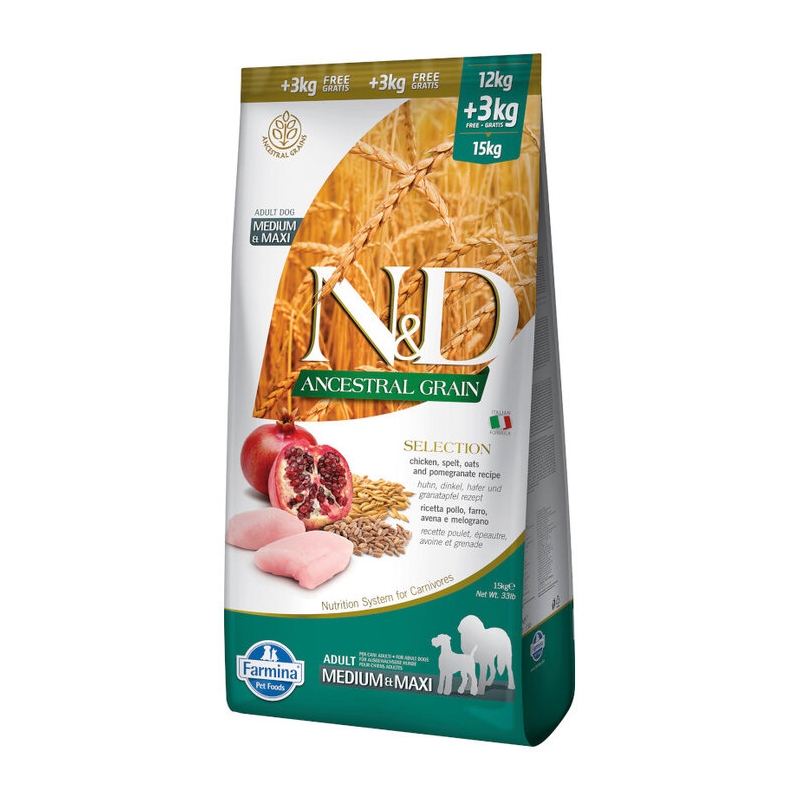 Farmina Pet Foods N&D Ancestral Grain Canine è un alimento equilibrato e completo per cani di taglia media e grande in età adulta. È realizzato con ingredienti naturali selezionati, come il pollo disossato e una miscela unica di cereali ancestrali. Questi cereali ancestrali sono stati consumati per migliaia di anni, con un alto contenuto di nutrienti che aiutano il cane a mantenere il suo peso ideale. Il pollo disossato è una fonte importante di proteine di alta qualità, che aiutano il cane a una migliore digestione. Inoltre, la miscela di cereali ancestrali fornisce alfa-idrati, amido, fibre, proteine vegetali e acidi grassi essenziali, con la capacità di una migliore digestione e assorbimento.