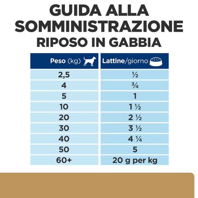 | Peso del cane - kg | Quantità giornaliera - Lattine da 200 g - Terapia intensiva - Riposo in gabbia | Quantità giornaliera - Lattine da 200 g - Terapia intensiva - Chirurgia, sepsi, cancro, trauma grave, febbre | Quantità giornaliera - Lattine da 200 g - Terapia intensiva - Bruciatura grave, trauma, trauma cranico |
