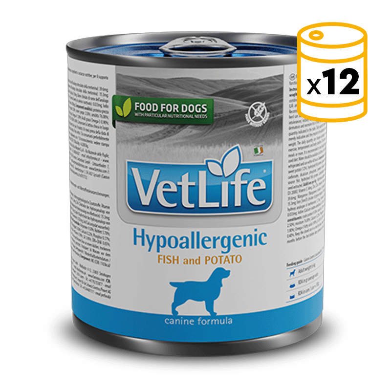Le Farmina Pet Foods per cani Farmina Vet Life Ipoallergenico Pesce & Patate includono ingredienti specifici come pesce e patate, una combinazione ipoallergenica ideale per tutti i cani che riduce al minimo le reazioni allergiche. Arricchite con minerali e vitamine essenziali, le dimensioni delle particelle garantiscono un'assorbimento superiore e una digestione migliorata. Le scatolette per cani con pesce e patate includono anche fibre prebiotiche naturali che promuovono la salute microbica del tratto digestivo e assicurano la nutrizione completa del tuo animale domestico.