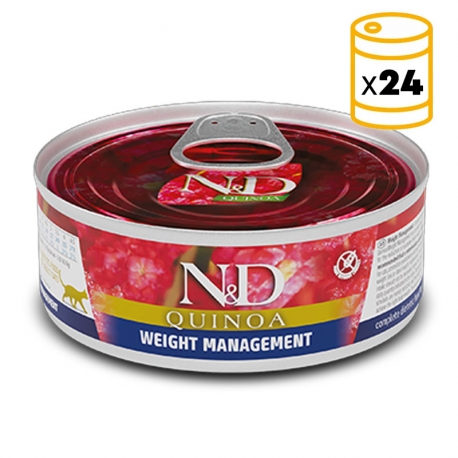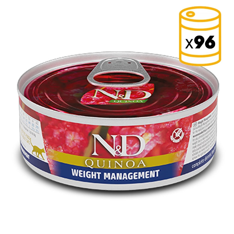 N&D Quinoa Weight Management è un cibo umido completo progettato per soddisfare le esigenze nutrizionali dei gatti adulti con sovrappeso o obesità. Questa formula specializzata offre una combinazione bilanciata di ingredienti attentamente selezionati per aiutare nella riduzione del peso corporeo e mantenere una condizione fisica sana nei felini.