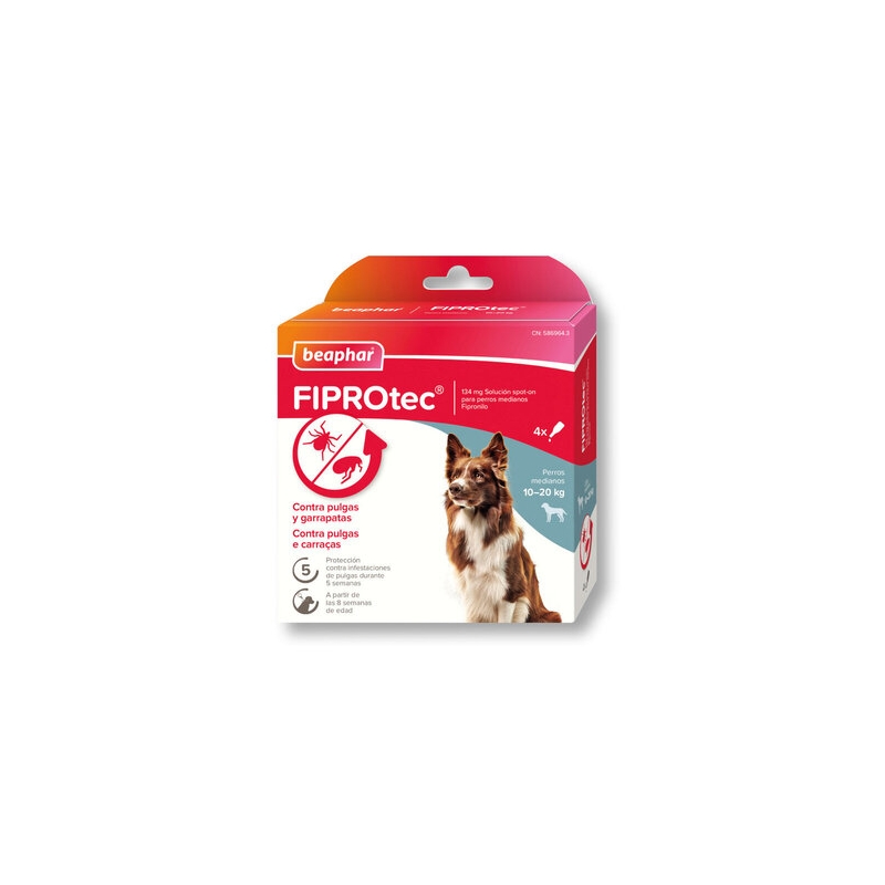 Pipette antiparassitarie per cani medi da 10 a 20 kg con fipronil, che eliminano pulci e zecche per contatto, offrendo fino a 5 settimane di protezione contro le pulci e 4 settimane contro le zecche con applicazione semplice ed efficace.