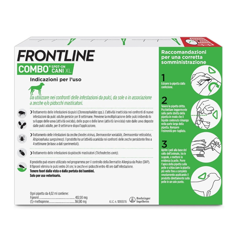Se ci sono più animali in casa, applicare la pipetta contemporaneamente. Utilizzare solo il prodotto corrispondente al peso del cane. Taglie disponibili: Per cani piccoli Frontline Combo 2 - 10Kg, per cani medi Frontline Combo 10 - 20Kg e per cani grandi Frontline Combo 20 - 40Kg.