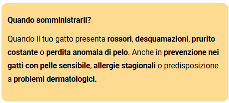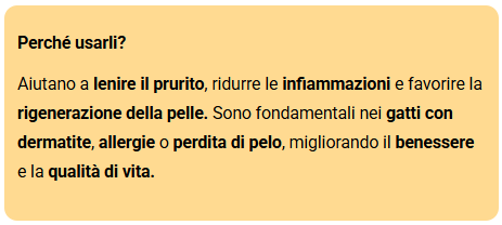 Aiutano a lenire il prurito, ridurre le infiammazioni e favorire la rigenerazione della pelle. Sono fondamentali nei gatti con dermatite, allergie o perdita di pelo, migliorando il benessere e la qualità di vita.
