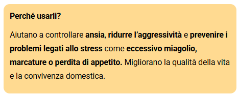 Aiutano a controllare ansia, ridurre l’aggressività e prevenire i problemi legati allo stress come eccessivo miagolio, marcature o perdita di appetito. Migliorano la qualità della vita e la convivenza domestica.