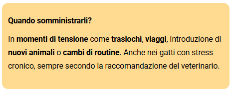 In momenti di tensione come traslochi, viaggi, introduzione di nuovi animali o cambi di routine. Anche nei gatti con stress cronico, sempre secondo la raccomandazione del veterinario.