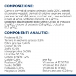 COMPOSIZIONE: Carni e sottoprodotti animali (pollo 22%), estratti di proteine vegetali, sottoprodotti di origine vegetale, cereali, pesci e sottoprodotti di pesce, zuccheri, uova e derivati delle uova, sostanze minerali, oli e grassi. Sostanze alcalinizzanti dell'urina: Citrato di potassio (1 g/kg), Cloruro di potassio (0,6 g/kg), L-cisteina (0,3 g/kg).