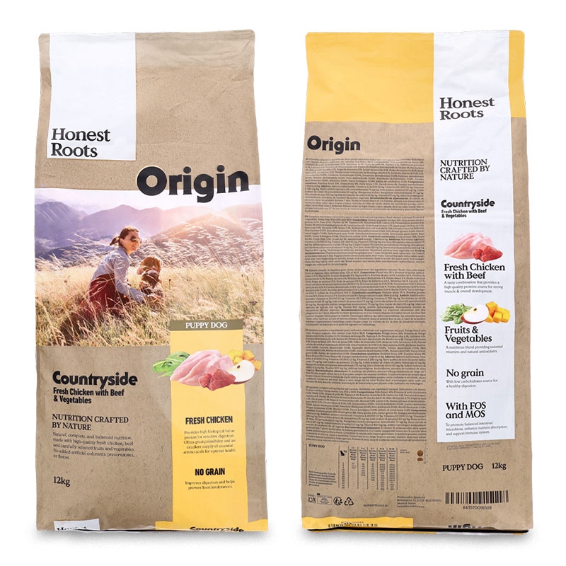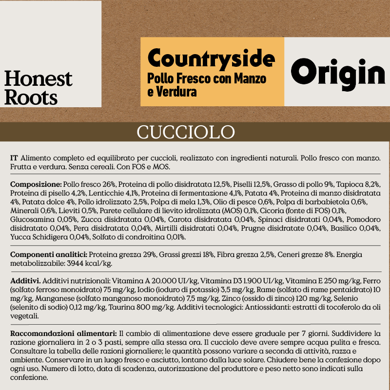 Honest Roots Origin presenta Countryside Puppy, crocchette naturali per cuccioli preparate con pollo fresco e manzo come principali fonti di proteine. La formula grain free, ricca di ingredienti naturali, è pensata per favorire una crescita sana e lo sviluppo ottimale di ossa, muscoli e sistema immunitario dei più giovani.
