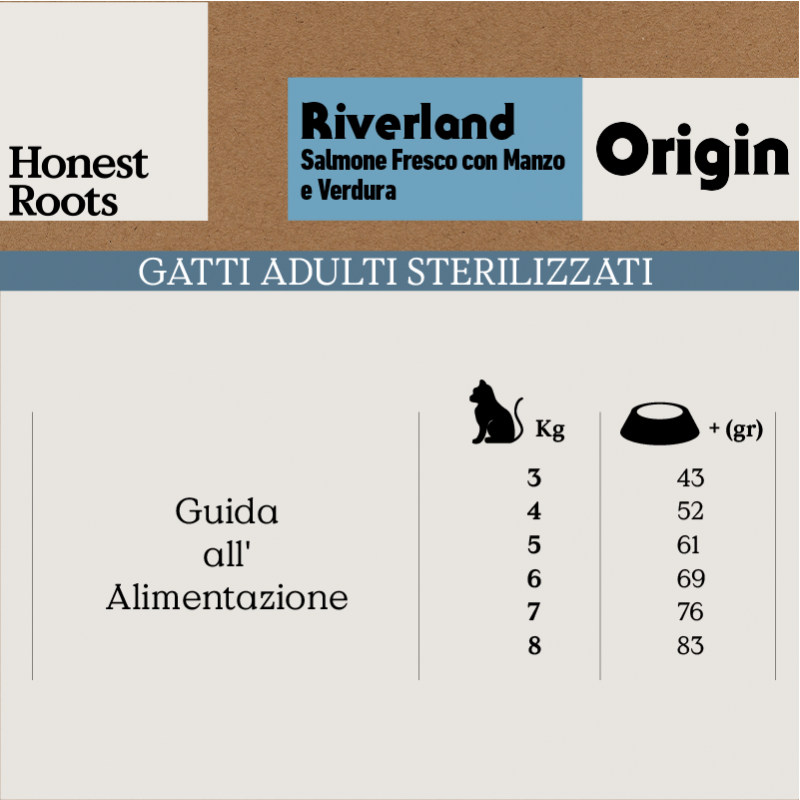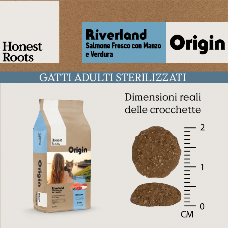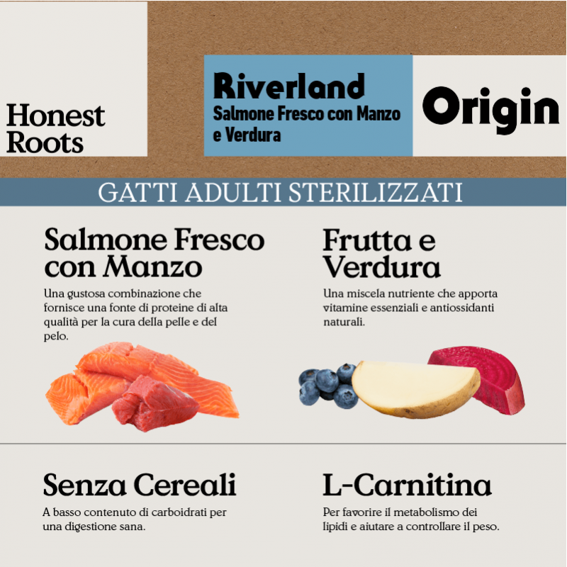 Honest Roots Origin Riverland sono crocchette naturali senza cereali per gatti sterilizzati che desiderano una dieta equilibrata, leggera e gustosa. La ricetta combina salmone fresco e carne di manzo, fonti proteiche di alta qualità che offrono vitalità, muscoli sodi e manto brillante. È un alimento completo con L-carnitina per aiutare a controllare il peso, ideale per gatti meno attivi dopo la sterilizzazione.