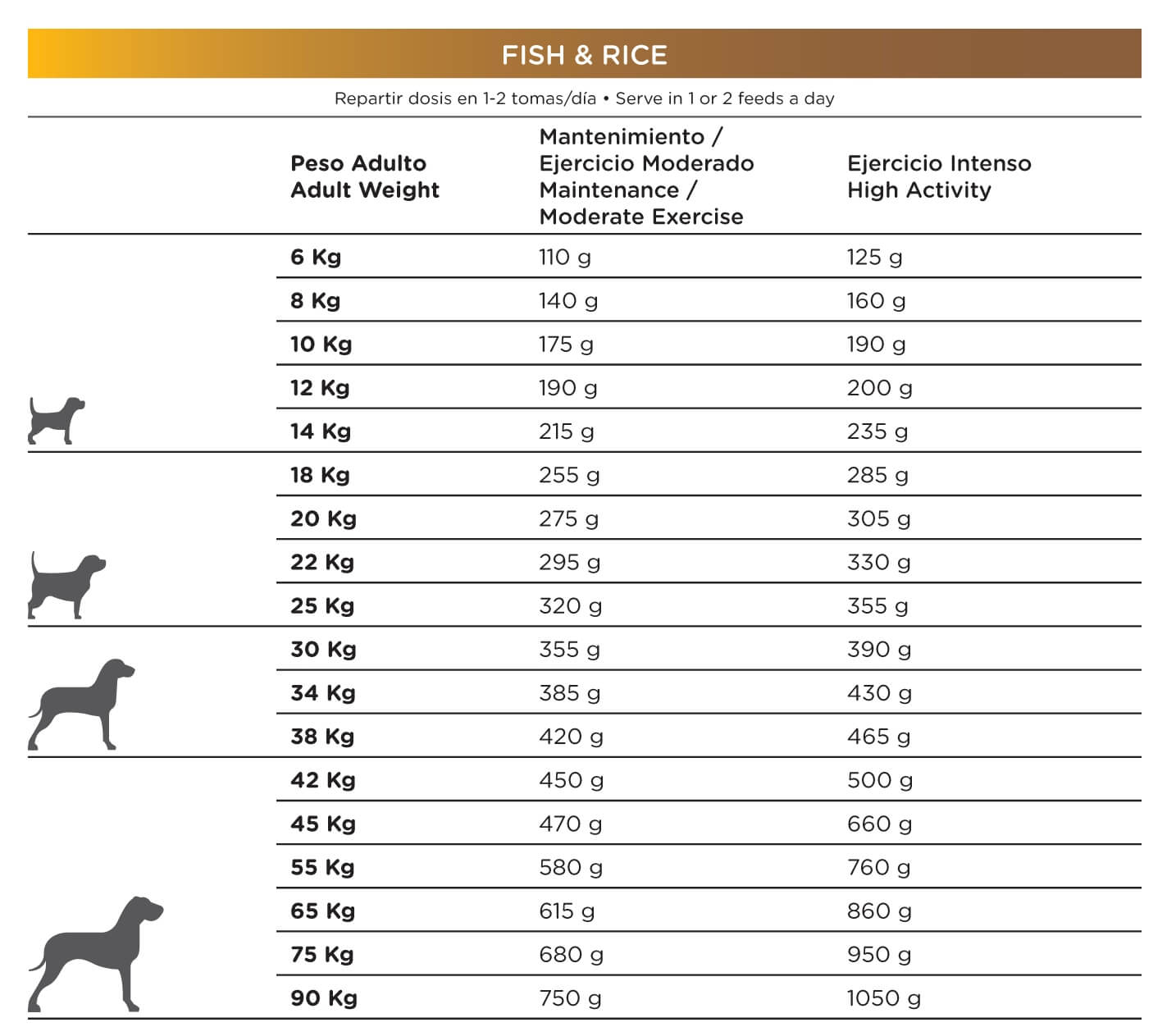Guarda la tabella delle porzioni giornaliere, queste quantità sono orientative, possono variare in base all'attività, alla razza del cane e alle condizioni ambientali.