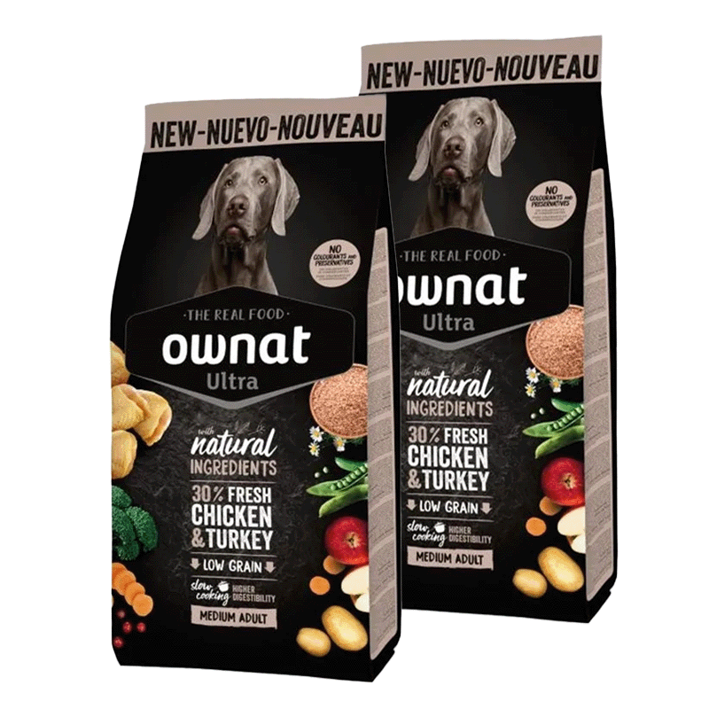 Ownat Ultra Medium Adult è una formula di alta qualità per cani di taglia media. Con ingredienti naturali, una significativa quantità di carne fresca e una limitata quantità di cereali, questo cibo promuove la digestione salutare e riduce le intolleranze.