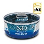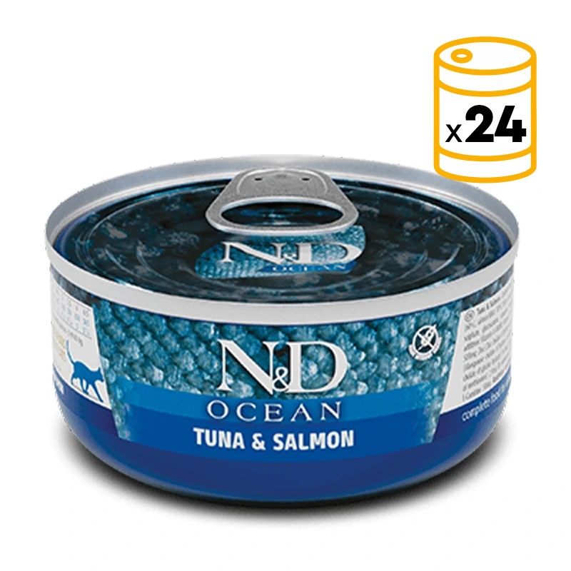 Scopri N&D Ocean Feline, un'opzione completa e nutritiva appositamente progettata per i gatti adulti. Con una squisita combinazione di tonno e salmone, questo cibo umido offre un'esperienza culinaria eccezionale per il tuo felino in crescita.