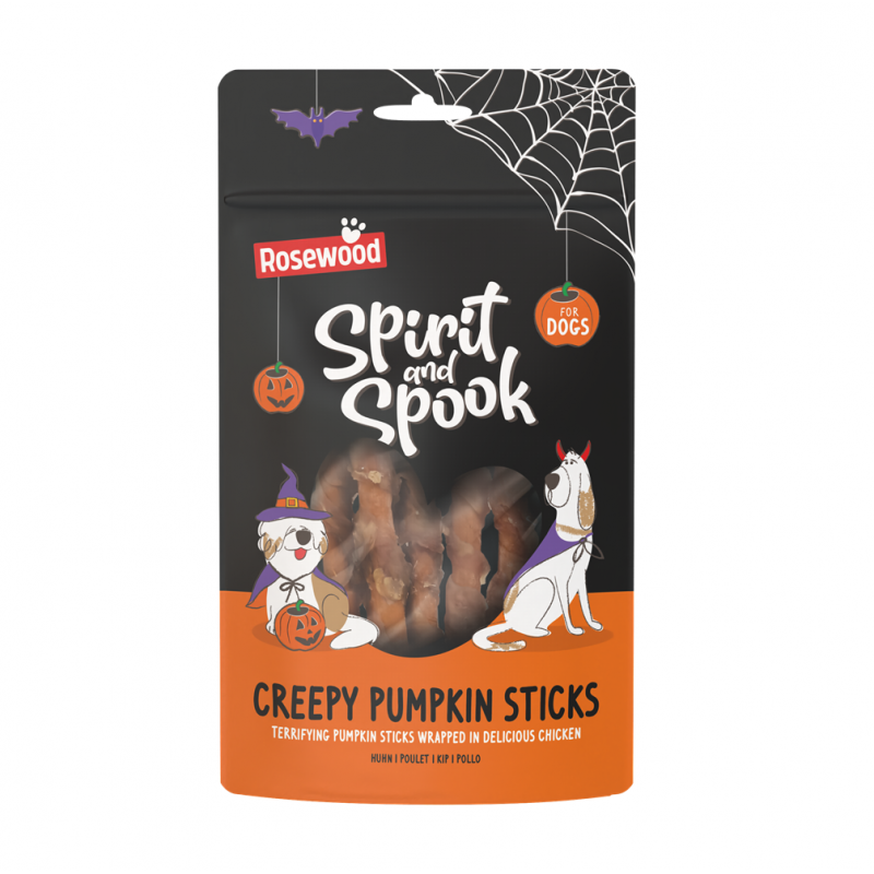 I Rosewood Sticks Zucca Spaventosi sono snack sani e deliziosi con 53% pollo e zucca. Texture morbida, perfetta per premiare il cane ad Halloween.