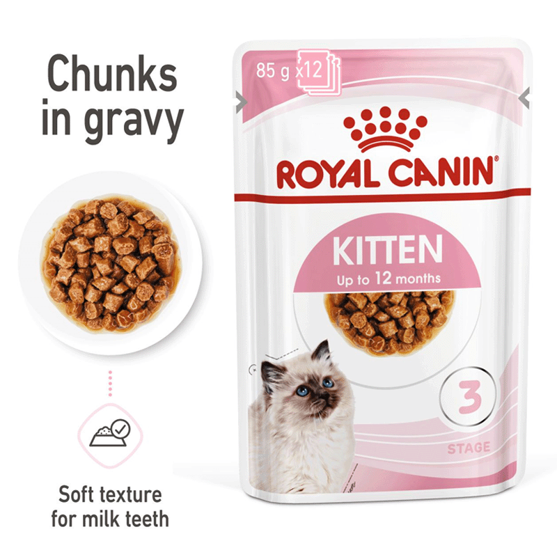 Royal Canin Kitten in salsa è un alimento completo per gattini fino a 12 mesi. La dose giornaliera per l'alimentazione esclusiva con questo prodotto è la seguente: