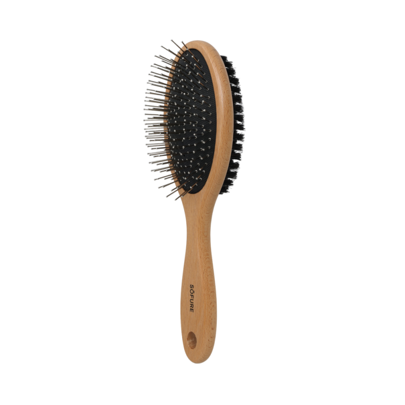 Spazzola doppia compatta con setole in acciaio per districare e rimuovere il pelo sciolto, e setole naturali per lucentezza; manico ergonomico in legno di faggio per cani e gatti a pelo medio/lungo.