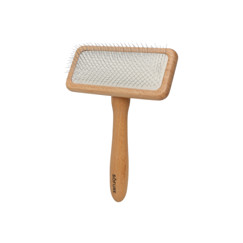 La spazzola Slicker Brush di Söfure è uno strumento di grooming per il cure quotidiane del pelo di cani e gatti. Realizzata in legno di faggio con manico ergonomico, offre presa comoda e precisa. Le setole sottili in acciaio aiutano a eliminare nodi e grovigli, rimuovendo il pelo morto e lasciando un manto più morbido, lucido e sano. Ideale per peli lunghi e medi.