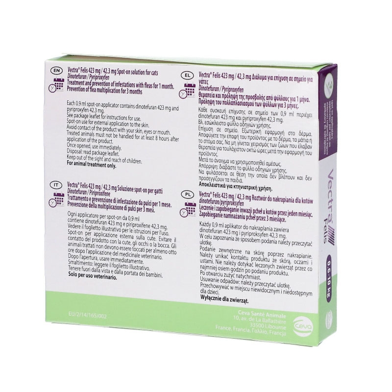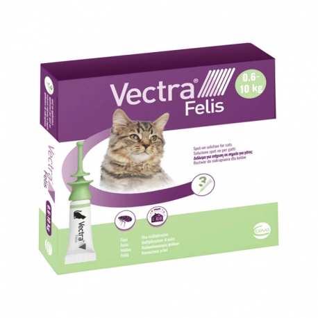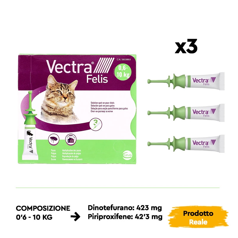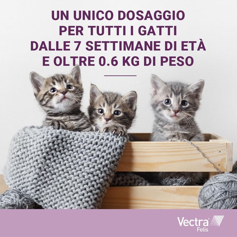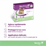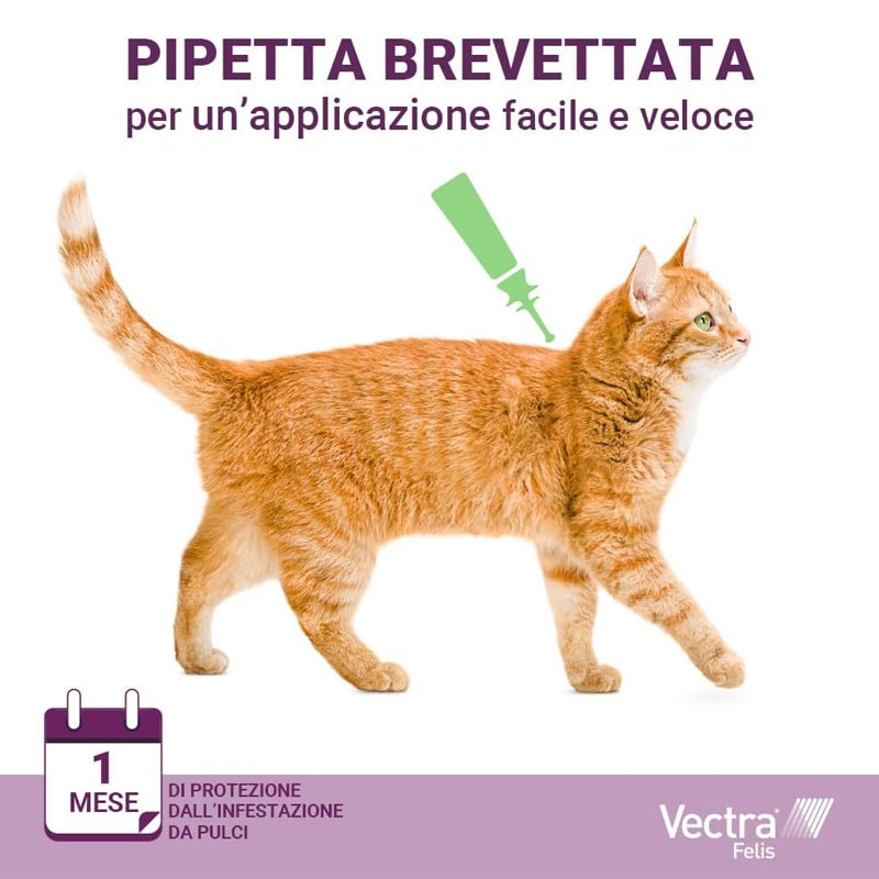La pipetta antiparassitaria VECTRA Felis, progettata per gatti a partire da 0,6 kg o con più di 7 settimane di età, non solo respinge ed elimina le pulci per un mese, ma agisce anche contro le uova e le larve delle pulci, offrendo una protezione prolungata di 3 mesi per prevenire possibili reinsediamenti in casa.