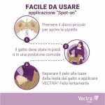 Per l'uso di VECTRA Felis, vengono fornite istruzioni chiare su come rimuovere l'applicatore spot-on dall'imballaggio e il modo corretto di applicarlo alla base della testa del gatto per un'assorbimento ottimale. È importante notare che il prodotto non deve essere utilizzato su gatti o gattini con un peso inferiore a 0,6 kg o con meno di 7 settimane di età, nonché nei casi di ipersensibilità alle sostanze attive o a uno qualsiasi degli eccipienti.