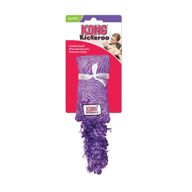 El juguete para gatitos Kong Kickeroo está diseñado para acompañar a los más pequeños en sus primeras etapas de juego activo. Su formato alargado y acolchado permite que el gato lo abrace con las patas delanteras mientras lo patea, muerde y araña, reproduciendo comportamientos naturales de caza y captura.