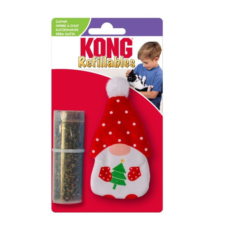 El KONG Holiday Refillables Gnome es un peluche ligero diseñado para estimular el instinto de caza del gato. Su bolsillo recargable permite añadir hierba gatera fresca en cualquier momento e incluye KONG Premium North American Catnip para mantener el interés y promover actividad y bienestar dentro del hogar.