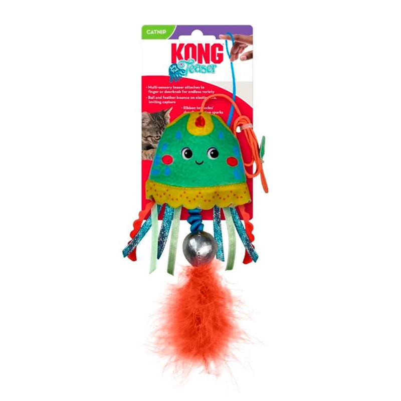 La bola y la pluma se mueven mediante un cordón elástico que genera rebotes impredecibles, invitando al gato a saltar y atrapar. Los tentáculos de cinta colgantes despiertan el bateo instintivo, mientras que la campana, los sonidos crujientes y el catnip premium refuerzan la estimulación sensorial y prolongan el tiempo de juego.