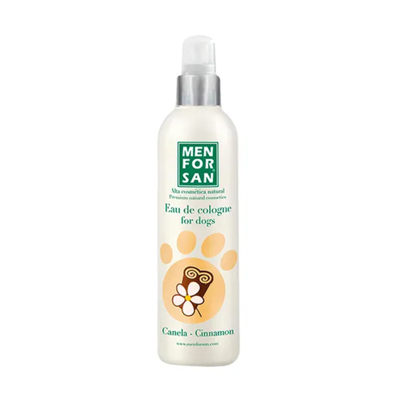 Agua de Colonia Men For San Canela para perros. Fragancia frutal y especiada, sin alcohol y con pH neutro. Respeta la piel y el olfato del perro. Aporta frescura y un aroma duradero después del baño.