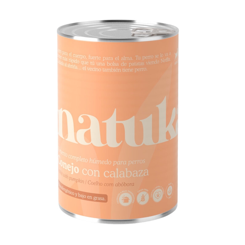 Comida húmeda natural para perros elaborada con conejo y calabaza, una receta monoproteica, hipoalergénica y baja en grasa que aporta ligereza, alta digestibilidad y sabor irresistible.