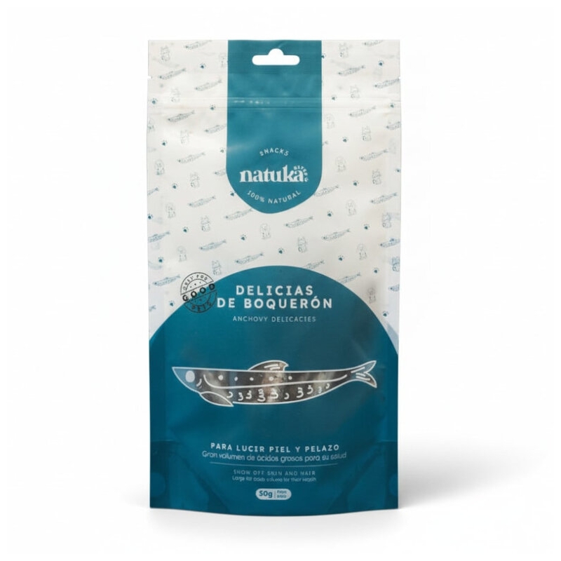 Delicia crujiente elaborada a base de boquerón 100% mediante deshidratación lenta para conservar su sabor y sus Omega-3 naturales. Un premio sin aditivos, alto en proteínas y bajo en grasa que encanta a tu perro o gato y contribuye a su bienestar diario, perfecto como refuerzo positivo o complemento entre comidas.