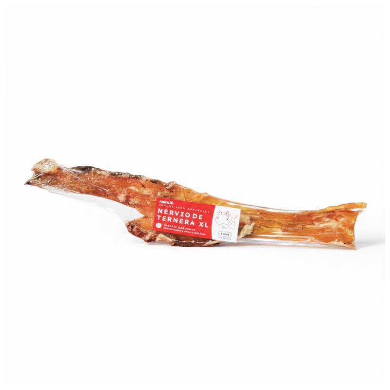 Snack natural XL de nervio de ternera deshidratado para perros medianos y grandes, rico en proteína, bajo en grasa y de masticación duradera que ayuda a la higiene dental.