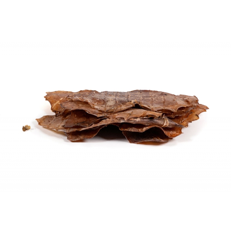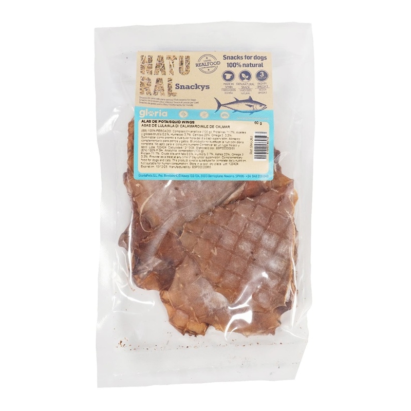 Snack natural de ala de pota deshidratada para perros, con 0% grasa y alto contenido proteico, que ayuda a limpiar los dientes y favorece la salud cardiovascular y visual.