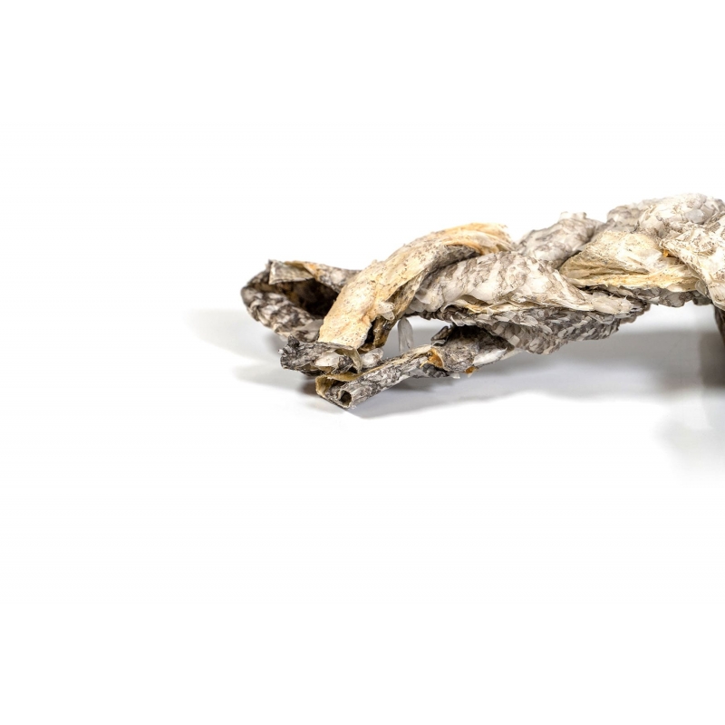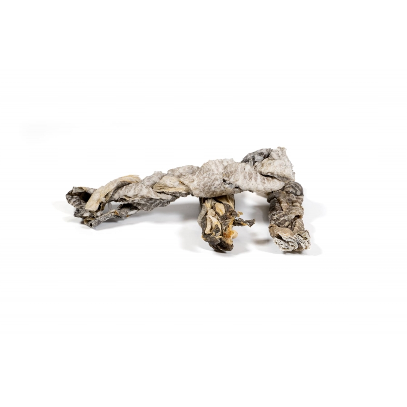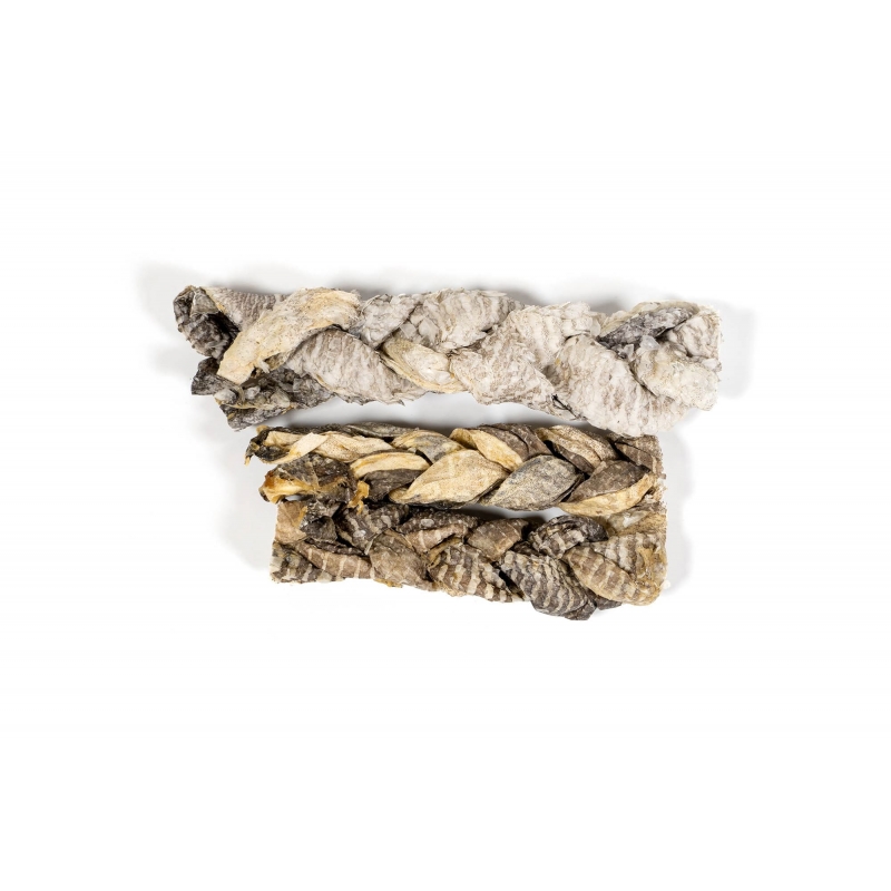 Snack natural de piel de bacalao trenzada, rico en Omega 3 y proteínas, ideal para mejorar la salud dental y el pelaje de tu perro.