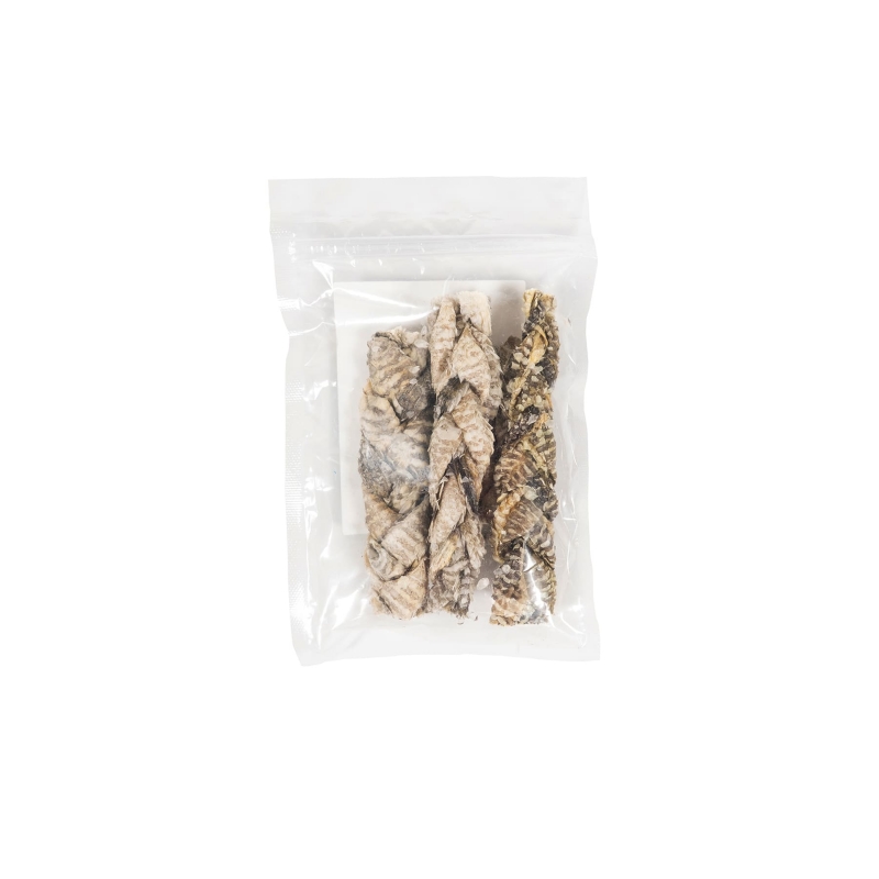 Las Trenzas de Piel de Bacalao Snackys son un snack 100% natural, elaborado con piel de bacalao deshidratada de alta calidad. Su forma trenzada lo convierte en un premio divertido y duradero, ideal para que tu perro disfrute mientras limpia sus dientes y fortalece las encías.