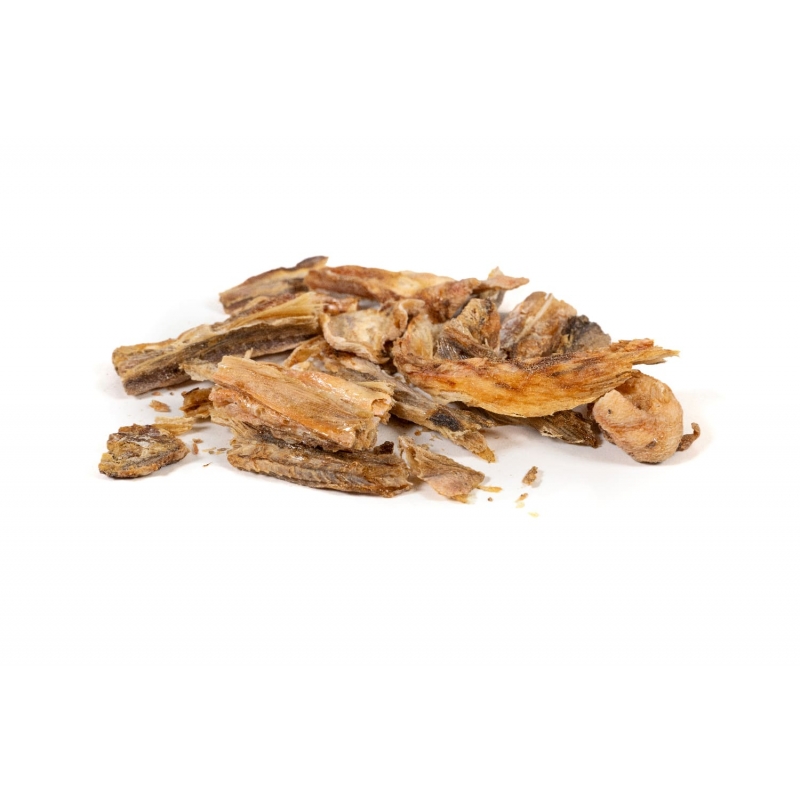 Trozos naturales de pescado deshidratado para perros, ricos en proteínas, Omega 3, calcio y fósforo, ideales para premiar y mejorar la salud dental y ósea.