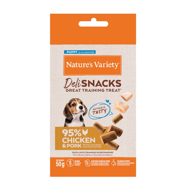 Los bocaditos Nature's Variety DeliSnacks están especialmente diseñados para cachorros en crecimiento. Con una combinación de pollo y cerdo, ofrecen un sabor irresistible que hará las delicias de tu pequeño amigo peludo. Su textura suave facilita la masticación, siendo ideales para entrenamientos y recompensas.