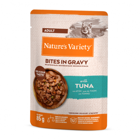 Si tu gato es amante del marisco, Nature´s Variety Bites en Salsa con Atún es la elección perfecta. Este alimento húmedo está elaborado con atún de alta calidad, proporcionando a tu mascota una fuente rica en proteínas y ácidos grasos esenciales. Complementado con nutritivas verduras como zanahorias y judías verdes, este producto es ideal para una alimentación equilibrada.
