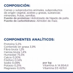 COMPONENTES ANALÍTICOS: Proteína bruta 5,0%, Grasa bruta 3,5%, Fibra bruta 1,2%, Carbohidratos 13,5%, Calcio 0,20%, Fósforo 0,14%, Magnesio 0,02%, Potasio 0,16%, Sodio 0,05%, Ácidos grasos omega-3 0,13%, Ácidos grasos omega-6 0,98%, Humedad 75,5%, Taurina 430 mg/kg, Beta-caroteno 1,0 mg, Vitamina A 8,42 UI, Vitamina C 25 mg, Vitamina D 330 UI, Vitamina E 160 mg.