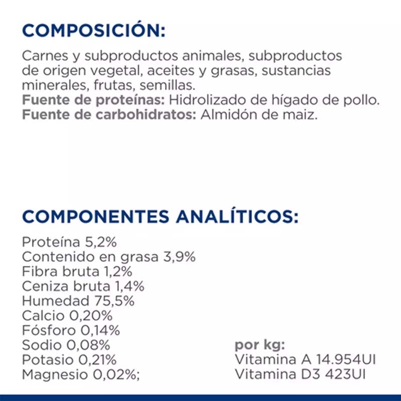 COMPOSICIÓN: Hígado de pollo hidrolizado, almidón de maíz, celulosa, aceite vegetal, minerales, vitaminas, DL-metionina, oligoelementos, taurina, L-treonina, L-triptófano.