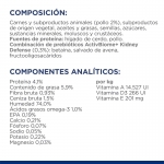 COMPOSICIÓN: Carnes y subproductos animales (pollo 5%), cereales, aceites y grasas, subproductos de origen vegetal, azúcares, semillas, verduras (1,2%), sustancias minerales, huevos y ovoproductos. Fuentes de proteína: pollo, hígado de cerdo, huevos desecados. Combinación de prebióticos ActivBiome+ Kidney Defense (0,29%): betaína, salvado de avena, fructooligosacáridos.
