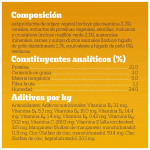 Composición analítica: Proteína bruta: 21%, contenido en grasa: 3%, materia inorgánica: 5%, fibra cruda: 1.1%, humedad: 24%.