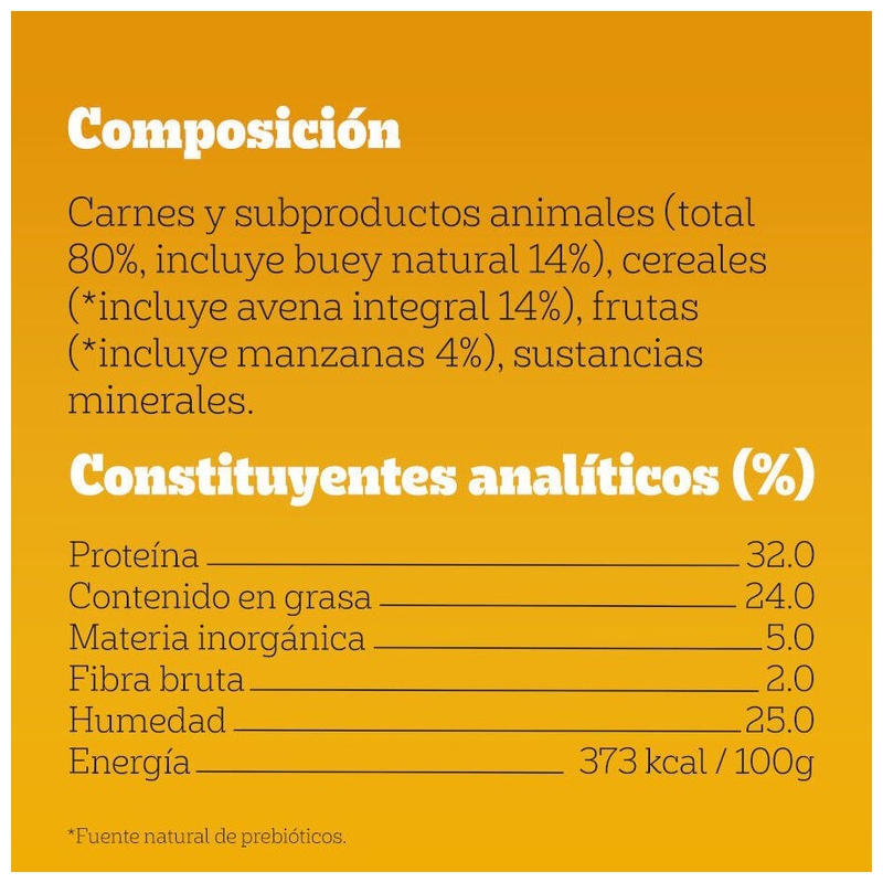Ingredientes: Carnes y subproductos animales (total 80%, incluye buey natural 14%), cereales (incluye avena integral 14%), frutas (incluye manzanas 4%), sustancias minerales. *Fuente natural de prebióticos.