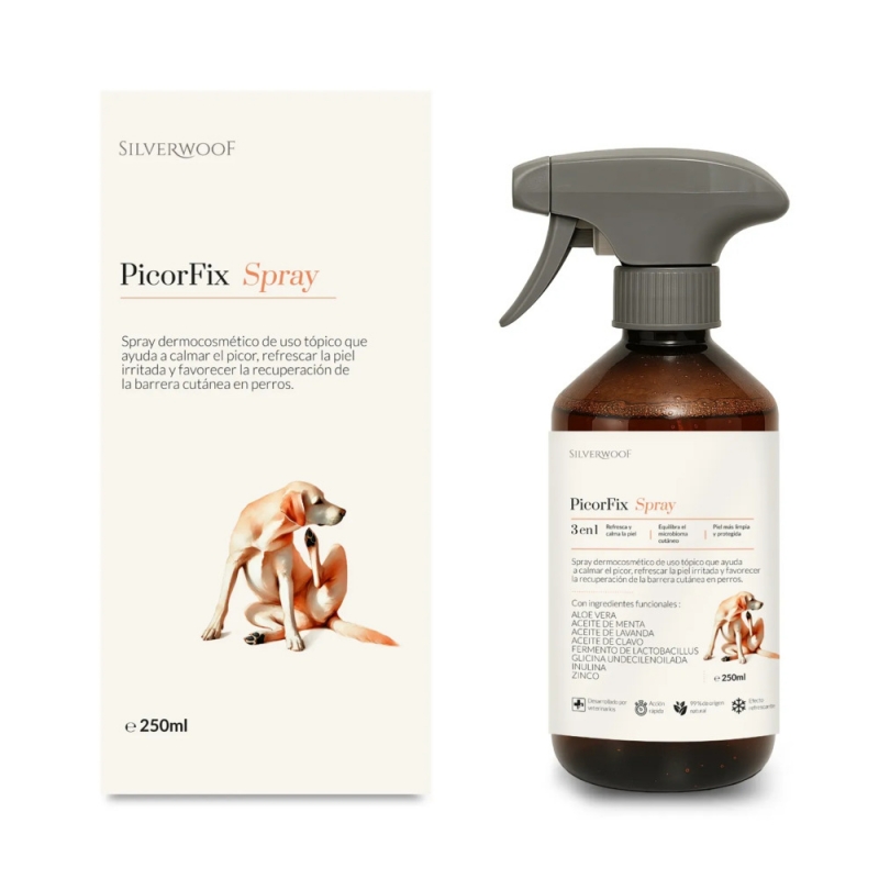 PicorFix Spray 250 ml es un spray antipicor para perros formulado con ingredientes naturales que proporciona un alivio inmediato del picor localizado, la irritación y el enrojecimiento de la piel. Su combinación de aloe vera, lactato de zinc y aceites esenciales ayuda a calmar la piel al instante mientras favorece la regeneración de la barrera cutánea.