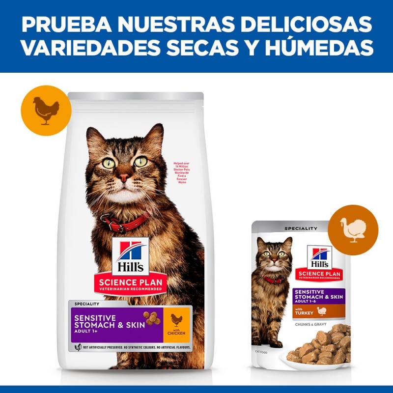 Hill's Science Plan Sensitive Stomach & Skin para gatos adultos promueve una digestión saludable y una piel vibrante.