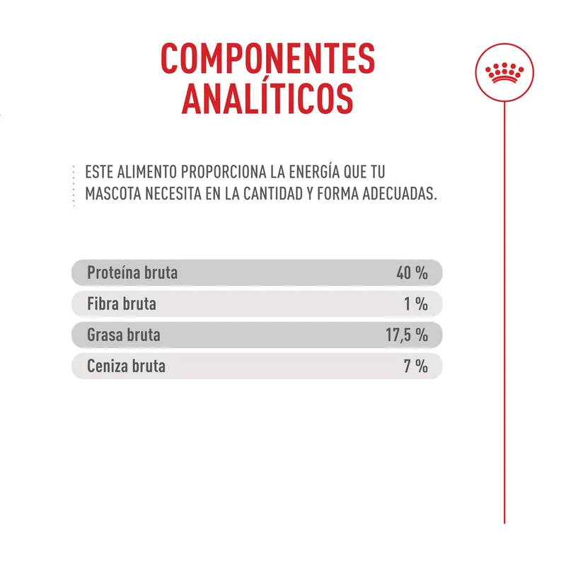 Componentes analíticos: Proteína bruta 40%, grasa bruta 17,5%, fibra bruta 1%, ceniza bruta 7%.