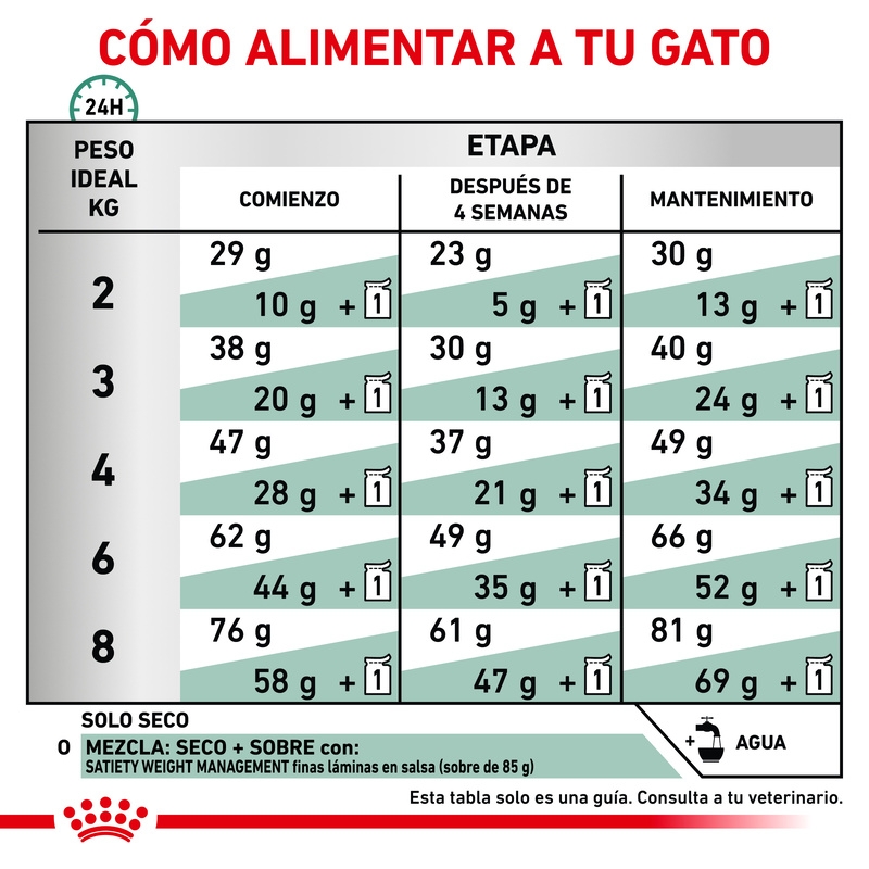 Es importante destacar que ROYAL CANIN® Satiety Weight Management es parte de la línea ROYAL CANIN® Veterinary Health Nutrition y debe ser recomendado por un veterinario. Si decides realizar una transición en la dieta de tu felino, se aconseja hacerlo gradualmente durante un período de 7 a 10 días y ajustar las porciones según las indicaciones del profesional, especialmente si optas por una alimentación mixta. Para satisfacer las preferencias individuales de cada gato, también ofrecemos ROYAL CANIN® Satiety Weight Management en forma de alimento húmedo con láminas finas en salsa.