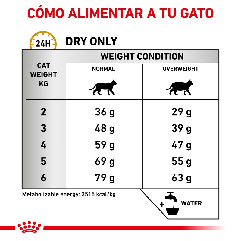 La cantidad de este pienso urinario moderado en calorías para gatos debe ajustarse al peso del gato y a su condición corporal (normal o con sobrepeso). Utiliza la siguiente tabla como guía orientativa y adapta la ración según las indicaciones del veterinario: