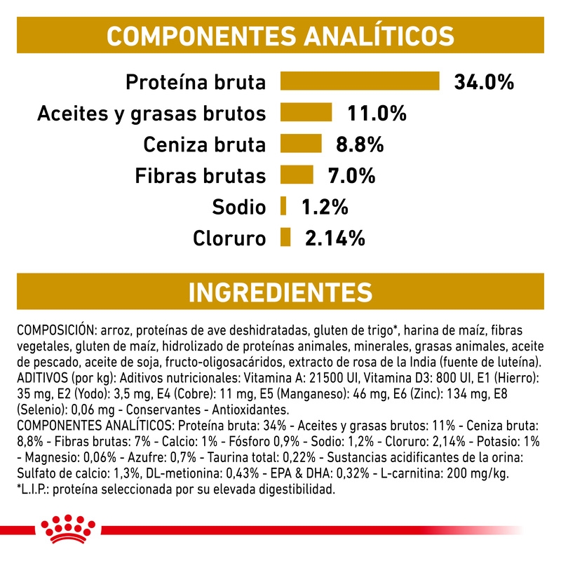 Composición: Arroz, proteínas de ave deshidratadas, gluten de trigo, harina de maíz, fibras vegetales, gluten de maíz, hidrolizado de proteínas animales, grasas animales, aceite de pescado, aceite de soja, fructo-oligosacáridos, extracto de Rosa de la India.