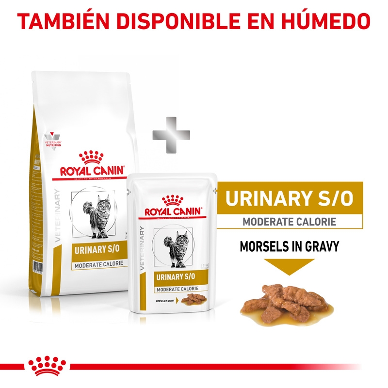 URINARY S/O MODERATE CALORIE es un alimento dietético completo para gatos, formulado para la disolución de cálculos de fosfato inorgánico y la reducción de la reaparición de cálculos de fosfato inorgánico, mediante sus propiedades de acidificación de la orina y su bajo contenido de magnesio. RECOMENDACIONES: Se recomienda consultar a un veterinario antes de utilizarlo. Utilizar URINARY S/O MODERATE CALORIE de 5 a 12 semanas para la disolución de cálculos de fosfato inorgánico y hasta 6 meses para reducir las recidivas de cálculos de fosfato inorgánico.